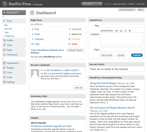 After you login, you will be able to go to the Dashboard by clicking on the word Dashboard at the top of the Word Press page. (See Picture Below)